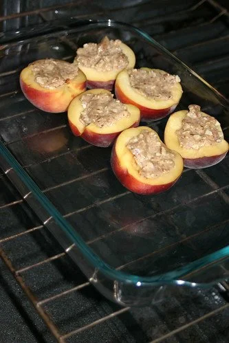 - Place peach halves, cut side up, in the prepared dish. Spread topping over the surface of each peach half (about 1 generous tablespoon each), pressing lightly to adhere and leaving a ¼-inch plain border.