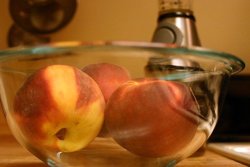 - 3 firm but ripe large peaches, rinsed, wiped clean of fuzz, halved, and pitted